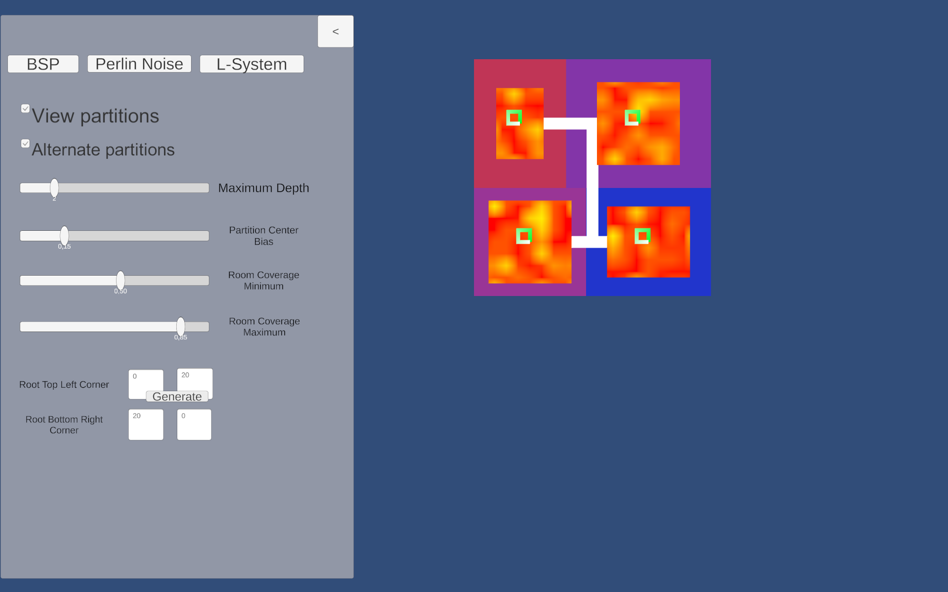 StaGen is a Unity tool that allows you to create stages procedurally using Procedural Content Generation Algorithms such as Binary Space Partitioning, Perlin Noise, and Bracketed L-System.